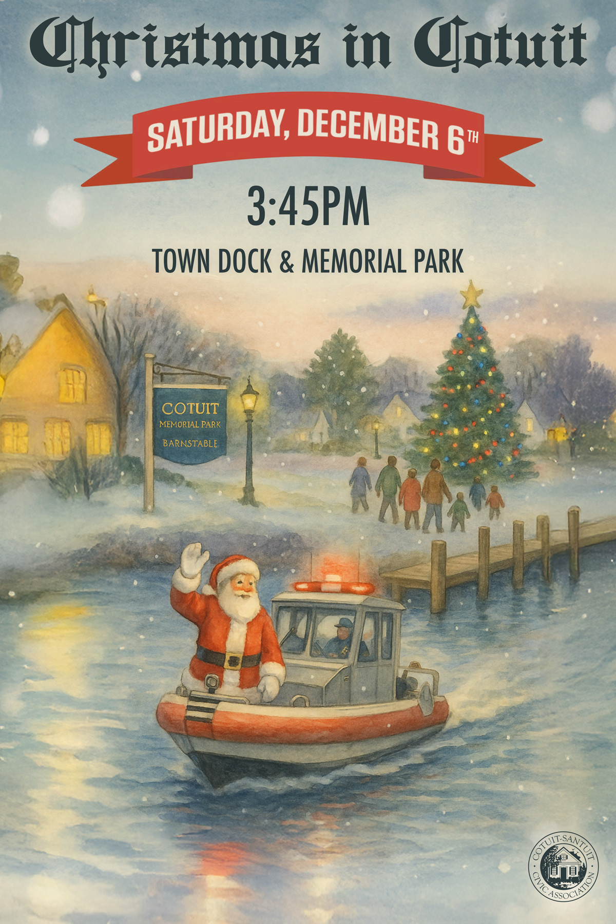 On the first Saturday in December every year, the lovable old gent is greeted by hundreds of Villagers at the Town Dock who are entertained with CSCA-supplied music, pizza, and good cheer. He arrives courtesy of the Cotuit Fire Department in their rescue boat/floating sleigh (Santa’s route from Pole to boat remains a closely-guarded secret).